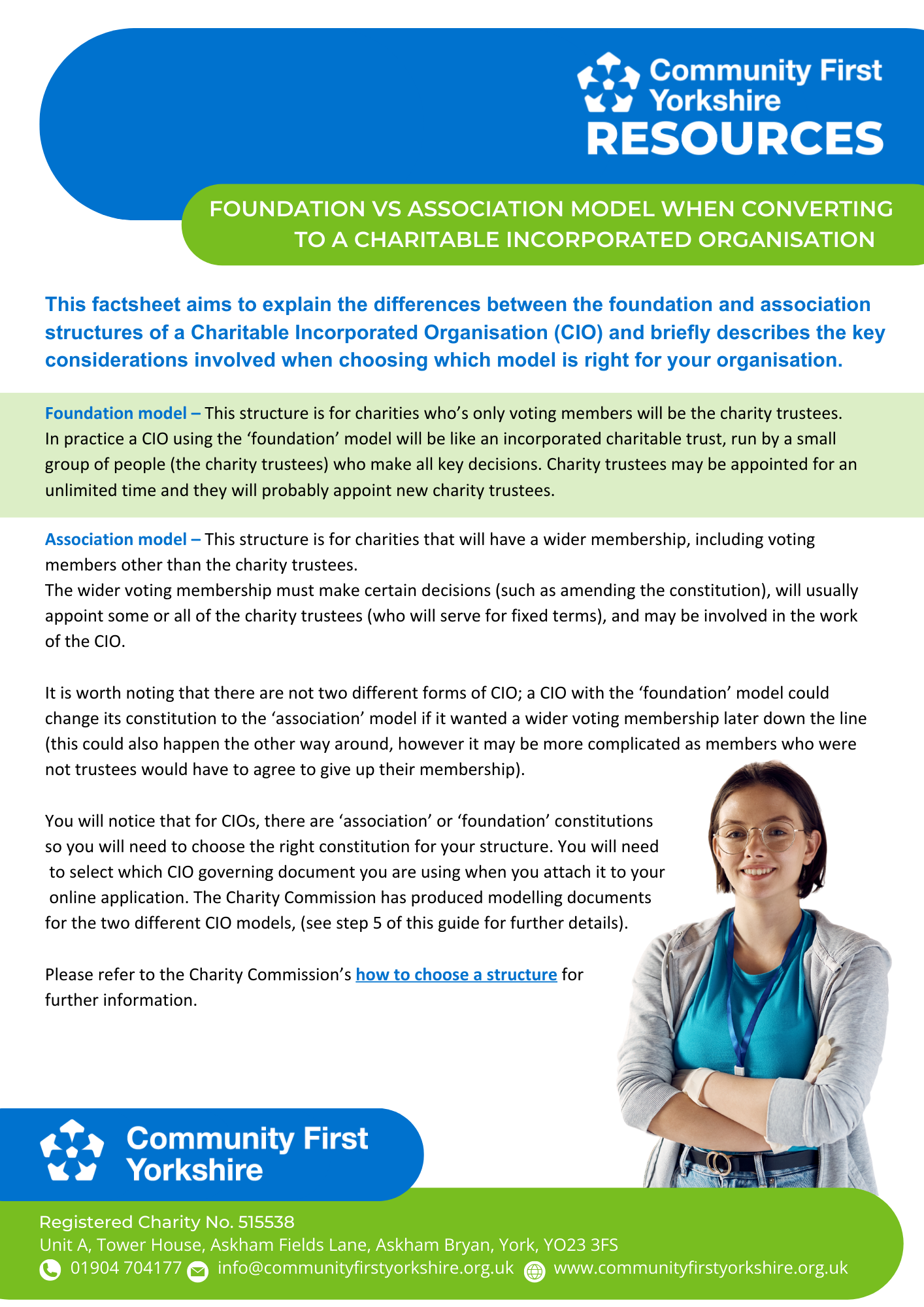 Foundation vs association model – this factsheet aims to explain the differences between the foundation and association structures of a Charitable Incorporated Organisation.